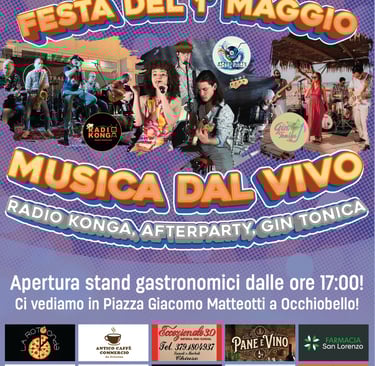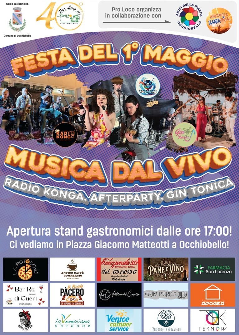 La Pro Loco di Occhiobello e Santa Maria Maddalena, in collaborazione con Gli Amici della Piazza e Atmosfera Santastica, vi aspetta Venerdi 1° maggio 2026 in Piazza Giacomo Matteotti per una serata di festa con musica dal vivo e stand gastronomici!