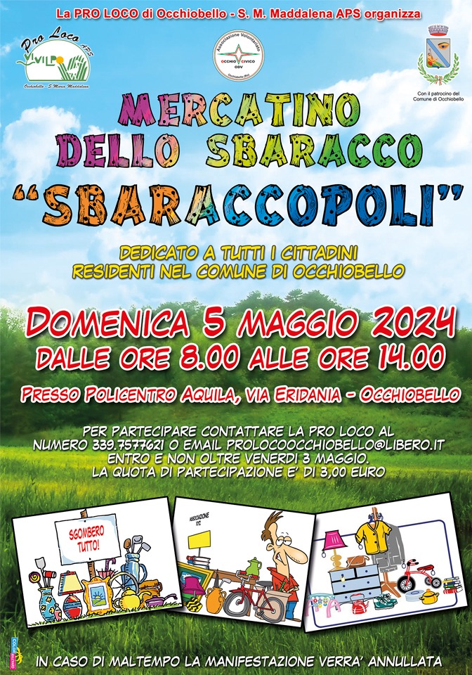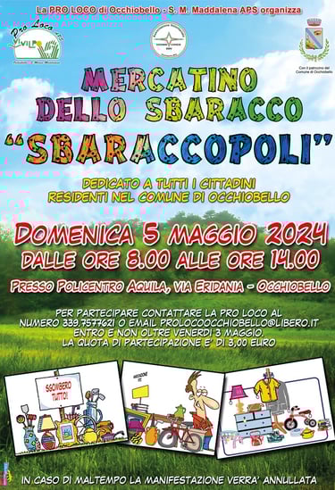 Domenica 5 maggio 2024 torna Sbaraccopoli, l’evento organizzato dalla Pro Loco di Occhiobello Santa Maria Maddalena, dedicato a tutti i residenti del Comune di Occhiobello. Dalle 8:00 alle 14:00 , presso il Policentro Aquila in via Eridania a Occhiobello, sarà possibile allestire il proprio spazio per vendere o scambiare oggetti usati, artigianato e tanto altro. Per partecipare è necessario contattare la Pro Loco e versare una quota di 3 euro, che consente di prenotare il proprio posto al mercatino.